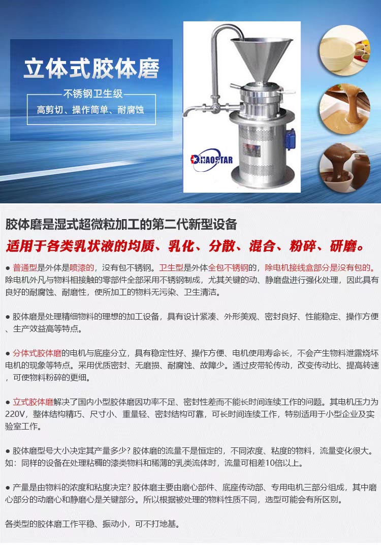 立式膠體磨[整體不銹鋼]精品型colloidmill-jiaotimo昊星科技http://www.86999999.com產品實用新型,外形新穎,整體衛生,環保節能。執行國家標準GB/T 14466和企業標準Q/WHX02-2019。