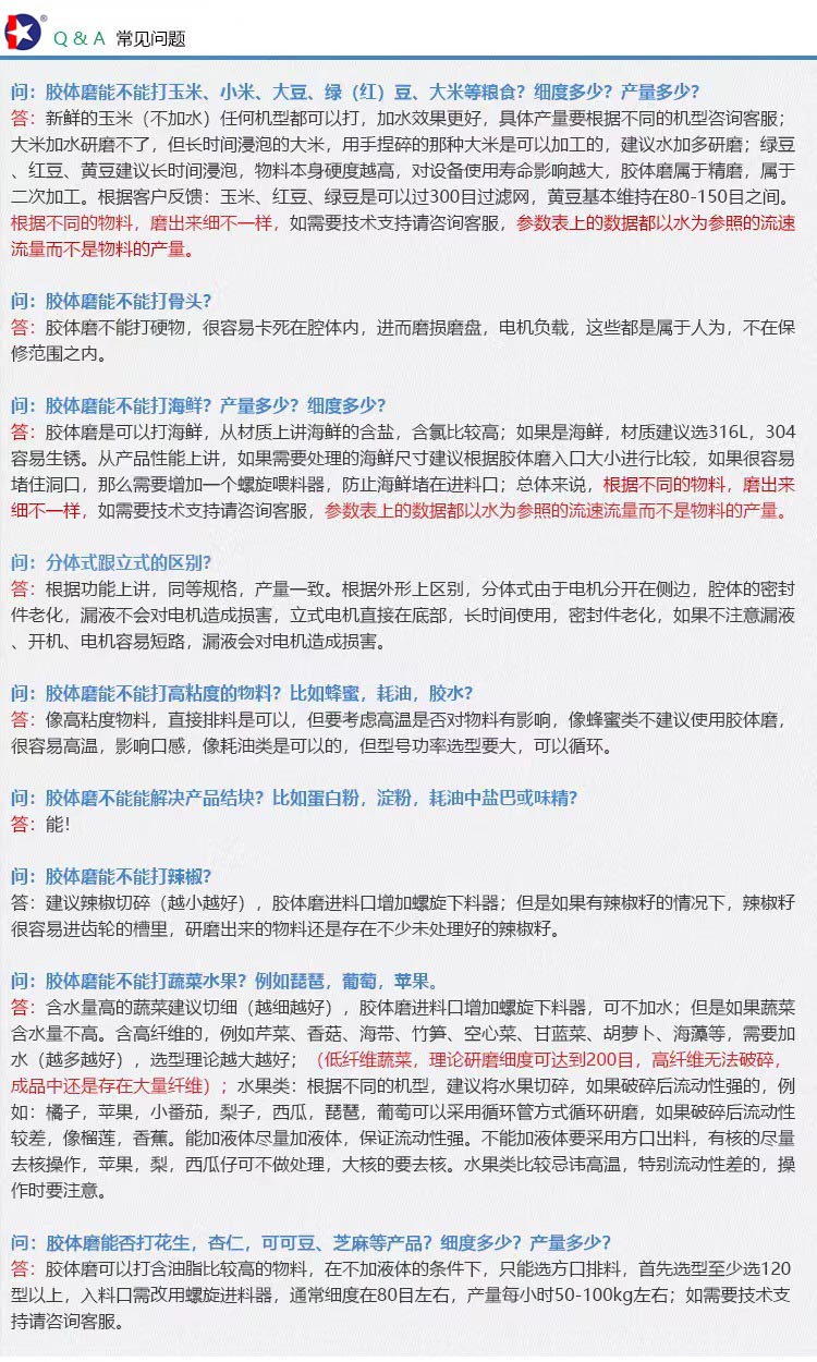 適用于超大流量的谷物類物料的粉碎作用,對于皮渣類物料的進一步粉碎要求的效果尤為顯著。如:辣椒、番茄皮渣、甜玉米、老玉米、大薯、白蘭豆、大豆、菠蘿、木薯、秸稈、海藻、催化劑、混懸液、煤焦油、重油、乳化混合油、生物、化工、炭黑、白炭黑、鈦白粉、麥、飼料、魚餌、包谷酒糟、白酒糟、啤酒糟、船用垃圾、生活垃極、畜牧垃極、餐廚污水處理、水產品廢料等.各類乳狀液或膏狀物介質物料,處理物料粘稠密度可大于10000厘泊的采用180型以上膠體磨。